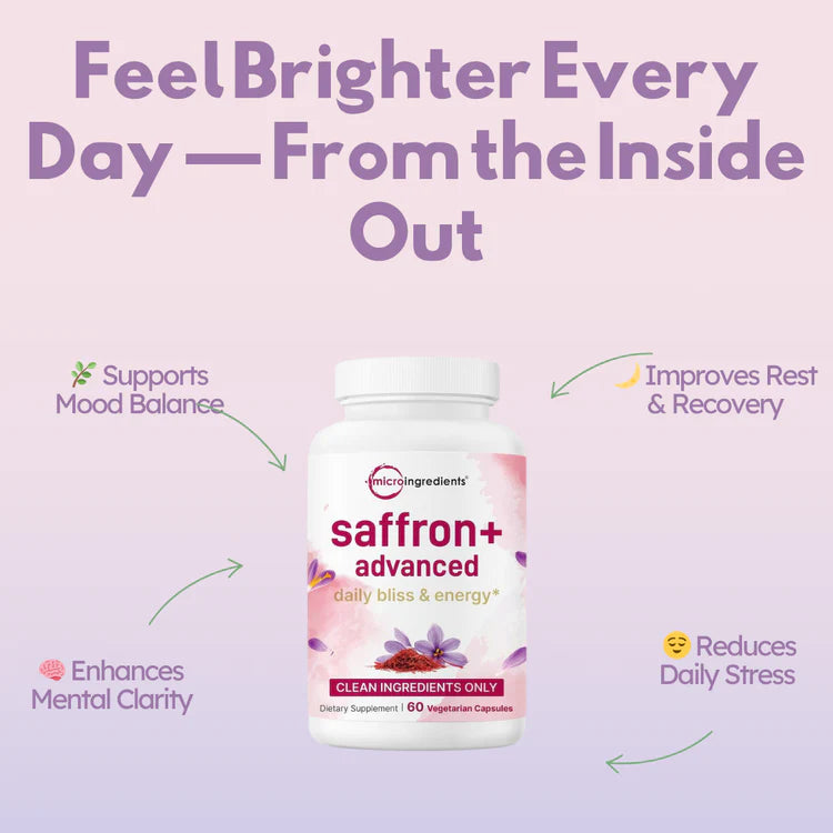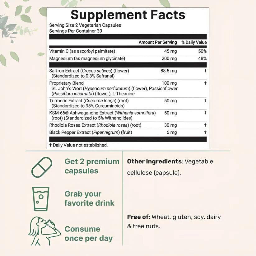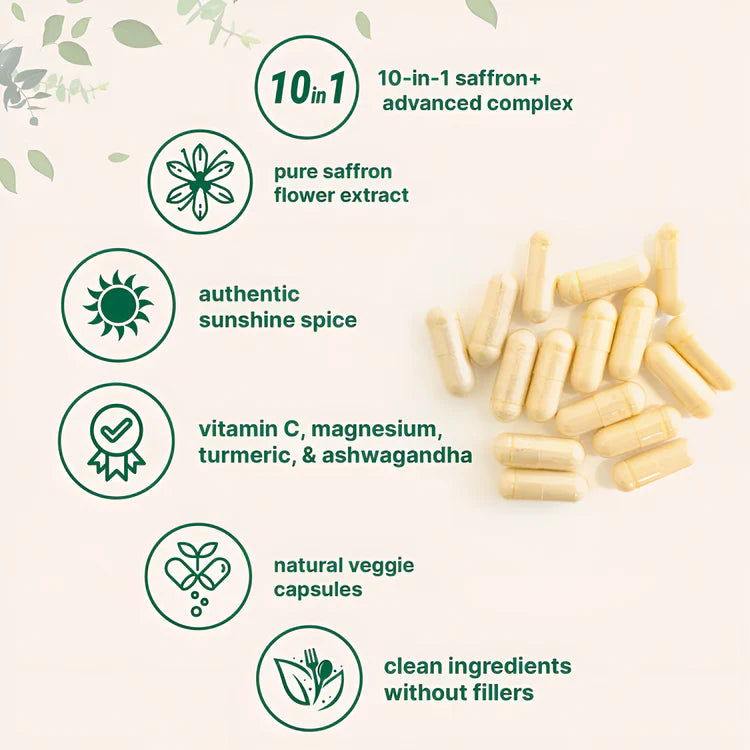 Our advanced saffron formula combines nature’s most trusted mood and mind supporters—Saffron, Turmeric, Ashwagandha, and more—to help you feel emotionally lighter, mentally sharper, and physically more at ease. This clean, plant-powered blend works from the inside out to naturally reduce stress, support serotonin levels, and promote calm, clarity, and daily resilience—without fillers, synthetics, or side effects.